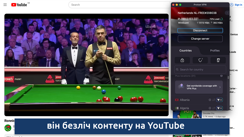 Proton VPN пропонує 100% безкоштовний тарифний план, який, на диво, містить пристойну кількість функцій та інструментів. Ви отримуєте безлімітний пакет даних для, наприклад, безперебійного перегляду потокового мультимедіа. Більшість безкоштовних VPN встановлюють ліміти використання даних, іноді обмежуючи пакети до 500 МБ на місяць, чого не вистачає, навіть, на перегляд одного фільму в HD-якості. Однак, один з наших дослідників використовуючи Proton VPN не вичерпав жодних лімітів під час того, як він дивився потокові трансляції більярдних матчів.
