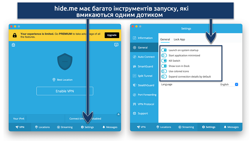 Як на абсолютно безкоштовну VPN для Мас, hide.me дуже гарний асортимент інструментів захисту і безпеки. StealthGuard дозволяє вам визначити, яким чином VPN буде реагувати на вашу мережу та додатки. Наприклад, ви можете обрати опцію прив’язки з’єднання з Інтернетом до цієї VPN щоб захистити всю свою мережу. Або інший варіант, ви можете обрати опцію обмеження програм підключенням до VPN, яка запобігає виникненню вразливостей шляхом блокування доступу до Інтернету певним програмам в разі розриву з’єднання з VPN.