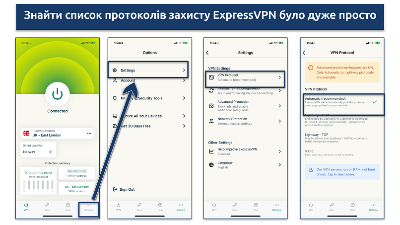 Завдяки технології обфускації, яка маскує VPN-трафік під звичайний Інтернет-трафік, ExpressVPN працює в цензурованих мережах та в країнах з жорсткою цензурою (таких як Китай та ОАЕ). Щоб оптимізувати ваше з’єднання для обфускації даних, перевірте, щоб в додатку був налаштований Автоматичний вибір протоколу (Automatic), таким чином система сама обере найкращий протокол захисту для приховування факту використання вами VPN.
